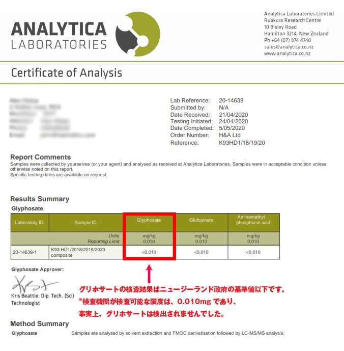 グリホサートの検査結果はニュージーランド政府の基準値以下です。