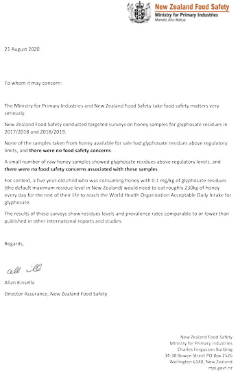 [1]New Zealand Food Safety has tested samples across several years for agricultural compounds, including insecticides, fungicides, herbicides and environmental contaminants in honey.After concerns raised by the honey industry New Zealand Food Safety conducted targeted surveys on honeys for glyphosate residues.