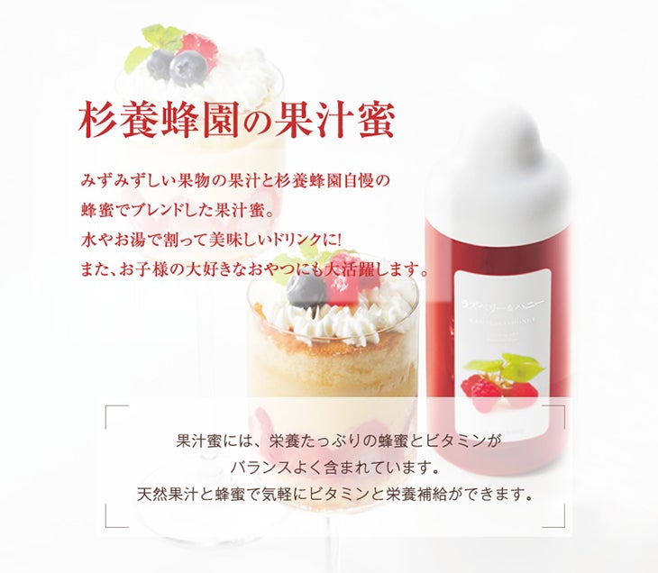 | 配合成分・原材料 | 精製はちみつ、ラズベリー果汁、クエン酸、増粘剤(ペクチン)、香料 |