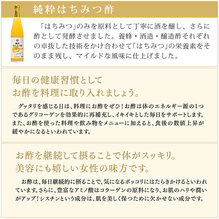 「はちみつ」のみを原料として丁寧に酒を醸し、さらに酢として発酵させました。 養蜂・酒造・醸造酢それぞれの卓抜した技術をかけ合わせて 「はちみつ」の栄養素をそのまま残し、マイルドな風味に仕上げています。蜂蜜とブレンドすればそのままでも飲みやすく、またお料理用としても幅広くお使いいただけます。