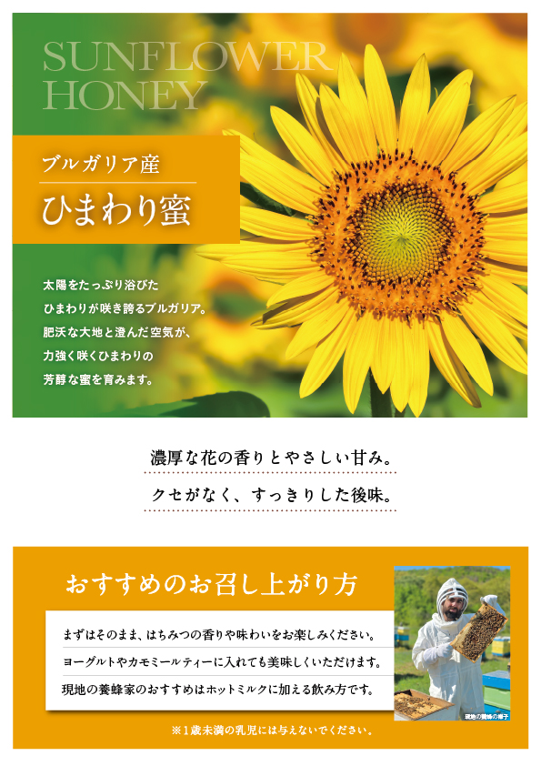 肥沃な大地と澄んだ空気が、力強く咲くひまわりの芳醇な蜜を育みます。
